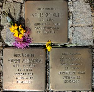 - Hier wohnte, Meer Schalit, Jg. 1884, verhaftet 1940, Sachsenhausen, tot 6.3.1940