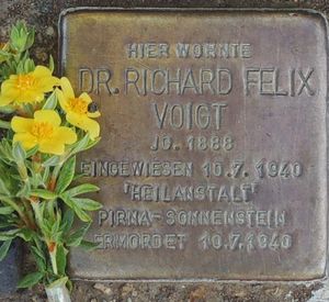 - Hier wohnte, Dr. Richard Felix Voigt, Jg. 1888, eingewiesen 10.7.1940, "Heilanstalt", Pirna-Sonnenstein, ermordet 10.07.1940