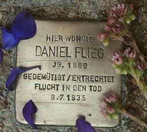 - Hier wohnte, Daniel Flieg, Jg. 1880, gedemütigt/entrechtet, Flucht in den Tod, 9.7.1935