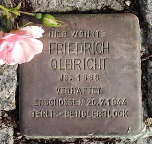 - Hier wohnte, Friedrich Olbricht, Jg. 1888, verhaftet, erschossen 20.7.1944, Berlin-Bendlerblock