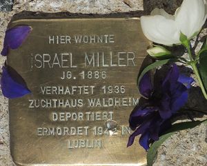 - Hier wohnte, Israel Miller, Jg. 1886, verhaftet 1936, Zuchthaus Waldheim, deportiert, ermordet 1942 in, Lublin