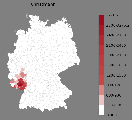 Relative Verteilung des Namens Christmann (1996)Direkt zur Karte Die Farbskala zeigt die Anzahl von "Christmann" bezogen auf je 1 Million Einträge. |