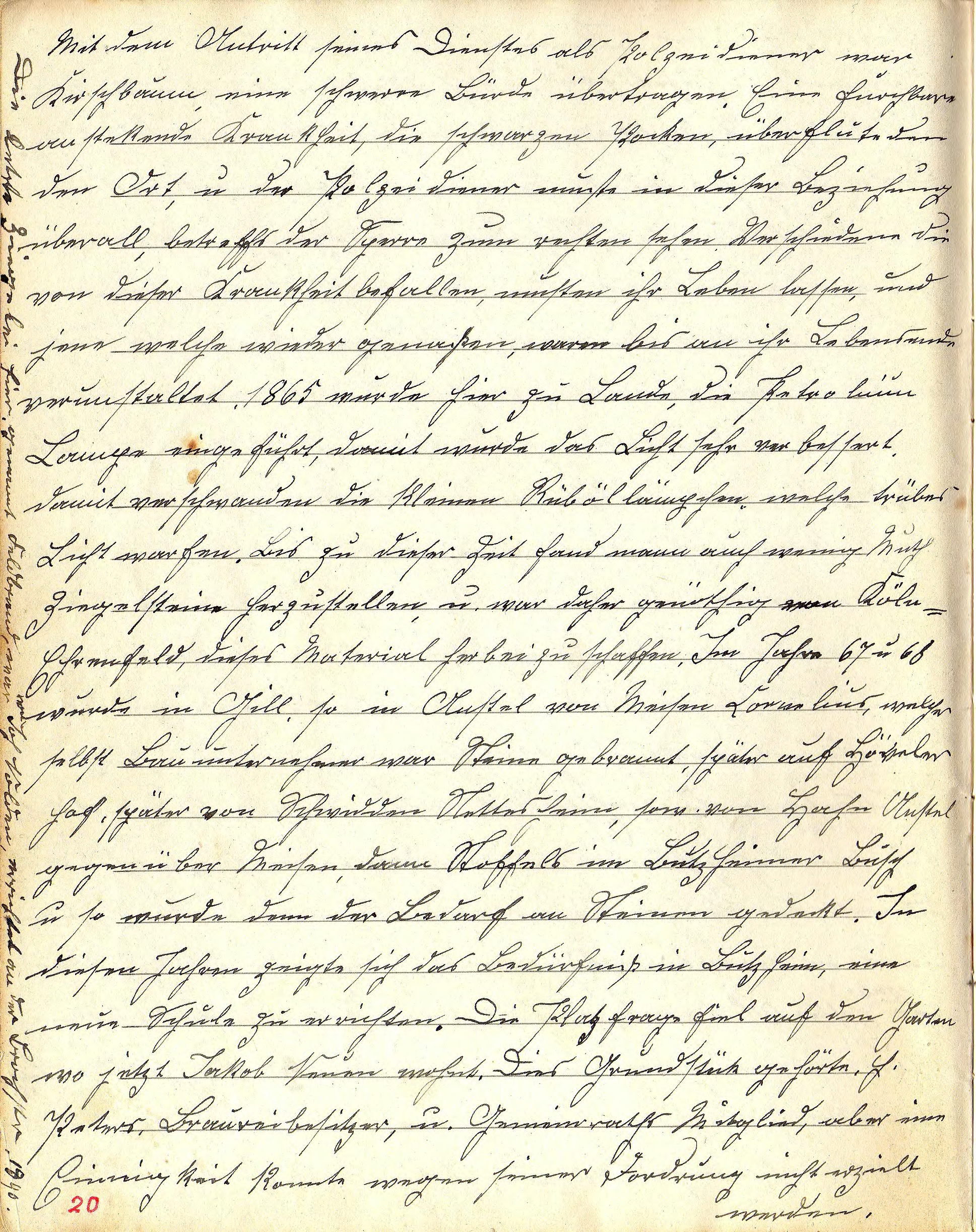 Mit dem Antritt seines Dienstes als Polizeidiener war Kirschbaum eine schwere Bürde übertragen. Eine furch(t)bare ansteckende Krankheit, die schwarzen Pocken überfluteten den Ort, u. der Polizeidiener musste in dieser Beziehung überall betreffs der Sperre zum rechten sehen. Verschiedene, die von dieser Krankheit befallen, mussten ihr Leben lassen, und jene, welche wieder genasen, waren bis an ihr Lebensende verunstaltet. 1865 wurde hier zu Lande, die Petroleum Lampe eingeführt, damit wurde das Licht sehr verbessert. Damit verschwanden die kleinen Rüböllämpchen welche trübes Licht warfen. Bis zu dieser Zeit fand man auch wenig Mut, Ziegelsteine herzustellen u. war daher genötigt, von Köln–Ehrenfeld dieses Material herbeizuschaffen. Im Jahre 67 u. 68 wurde in Gill, so in Anstel von Meisen Cornelius, welcher selbst Bauunternehmer war, Steine gebrannt, später auf Hövelerhof, später von Schwidden Nettesheim, sowie von Hahn, Anstel gegenüber Meisen, dann Stoffels im Butzheimer Busch u. so wurde dann der Bedarf an Steinen gedeckt. Die letzte Ziegelei hier, genannt Feldbrand, war von Joh. Nolden errichtet an der Broichstr., 1840. (Notiz am linken Seitenrand) In diesen Jahren zeigte sich das Bedürfnis, in Butzheim, eine neue Schule zu errichten. Die Platzfrage fiel auf den Garten, wo jetzt Jakob Neuen wohnt. Dies Grundstück gehörte H. Peters, Brauereibesitzer u. Gemeinderats Mitglied, aber eine Einigkeit konnte wegen seiner Forderung nicht erzielt werden.