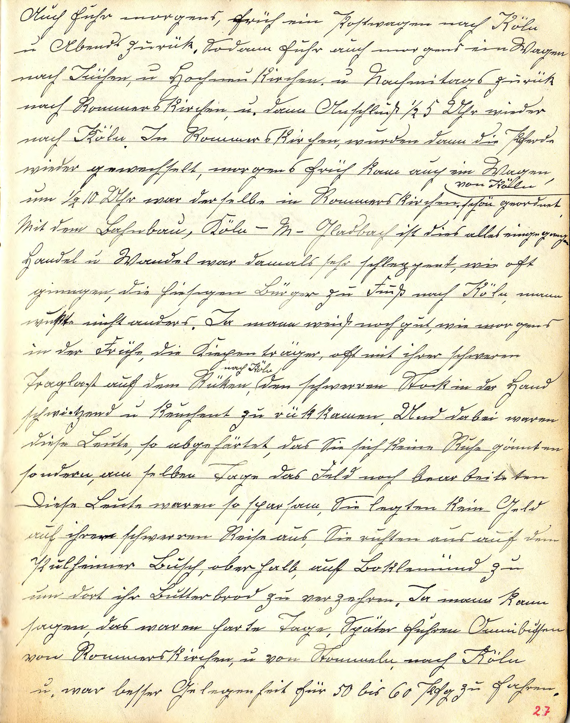 Auch fuhr morgens früh ein Postwagen nach Köln u. Abends zurück. Sodann fuhr auch morgens ein Wagen nach Jüchen u. Hochneukirchen u. nachmittags zurück nach Rommerskirchen u. dann Anschluss ½5 Uhr wieder nach Köln. In Rommerskirchen wurden dann die Pferde wieder gewechselt. Morgens früh kam auch ein Wagen von Köln, um ½10 Uhr war derselbe in Rommerskirchen schön geordnet. Mit dem Bahnbau Köln – M.Gladbach ist dies alles eingegangen. Handel u. Wandel war damals sehr schleppend, wie oft gingen die hiesigen Bürgen zu Fuß nach Köln, man wusste nicht anders. Ja, man weiß noch gut, wie morgens in der Frühe die Kiepenträger, oft mit ihrer schweren Traglast auf dem Rücken nach Köln, den schweren Stock in der Hand schwitzend und keuchend zurückkamen. Und dabei waren diese Leute so abgehärtet, das sie sich keine Ruhe gönnten, sondern am selben Tage das Feld noch bearbeiteten. Diese Leute waren so sparsam, sie legten kein Geld auf ihrer schweren Reise aus. Sie ruhten aus auf dem Pulheimer Busch, oberhalb, auf Bocklemünd zu, um dort ihr Butterbrot zu verzehren. Ja man kann sagen, das waren harte Tage. Später fuhren Omnibusse von Rommerskirchen u. von Stommeln nach Köln u. war besser Gelegenheit für 50 bis 60 Pfg. zu fahren.