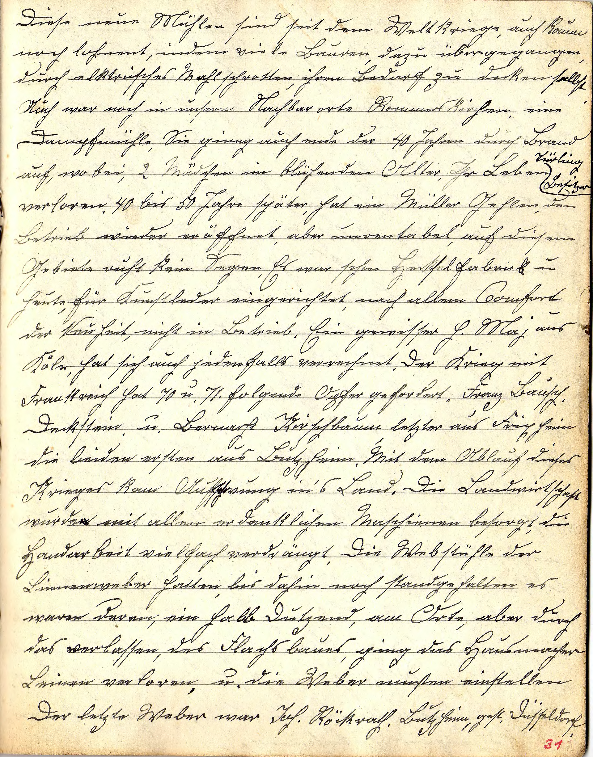 Diese neuen Mühlen sind seit dem Weltkriege auch kaum noch lohnend, indem viele Bauern dazu übergegangen durch elektrisches Mahlschroten ihren Bedarf zu decken selbst. Auch war noch in unserm Nachbarorte Rommerskirchen eine Dampfmühle (Türling Besitzer). Sie ging auch Ende der 40 Jahren durch Brand auf, wobei 2 Mädchen im blühenden Alter Ihr Leben verloren. 40 bis 50 Jahre später hat ein Müller Gehlen den Betrieb wieder eröffnet, aber unrentabel, auf diesem Gebiete ruht kein Segen. Es war schon Heckselfabrik u. heute für Kunstleder eingerichtet, nach allem Comfort der Neuzeit, nicht in Betrieb. Ein gewisser H. Mai aus Köln hat sich auch jedenfalls verrechnet. Der Krieg mit Frankreich hat 70 u. 71 folgende Opfer gefordert. Franz Bausch, Deckstein u. Bernhart Kirschbaum, letzter aus Frixheim, die beiden ersten aus Butzheim. Mit dem Ablauf dieses Krieges kam Aufschwung ins Land. Die Landwirtschaft wurde mit allen erdenklichen Maschinen besorgt, die Handarbeit vielfach verdrängt. Die Webstühle der Linnenweber hatten bis dahin noch standgehalten, es waren deren ein halb Dutzend am Orte, aber durch das verlassen des Flachsbaues ging das Hausmacher Leinen verloren, u. die Weber mussten einstellen. Der letzte Weber war Joh. Röckrath, Butzheim, gest. Düsseldorf.
