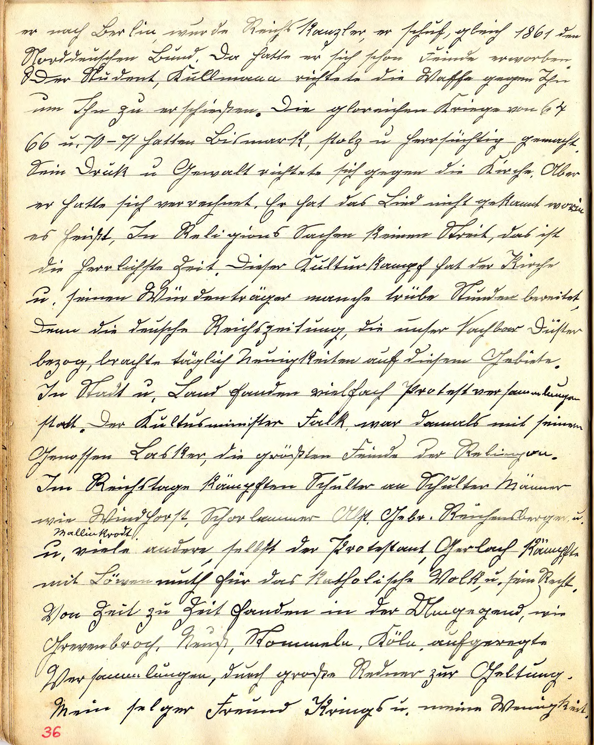 er nach Berlin, wurde Reichskanzler, er schuf gleich 1861 den Norddeutschen Bund. Da hatte es sich schon Feinde erworben. Der Student Kullmann richtete die Waffe gegen Ihn, um Ihn zu erschießen. Die glorreichen Kriege von 64, 66 u. 70-71 hatten Bismarck stolz u. herrschsüchtig gemacht. Sein Druck u. Gewalt richtete sich gegen die Kirche. Aber er hatte sich verrechnet, er hat das Lied nicht gekannt, worin es heißt: In Religions Sachen keinen Streit, das ist die herrlichste Zeit. Dieser Kulturkampf hat der Kirche u. seinen Würdenträgern manche trübe Stunde bereitet. Denn die deutsche Reichszeitung, die unser Nachbar Düster bezog, brachte täglich Neuigkeiten auf diesem Gebiete. In Stadt u. Land fanden vielfach Protestversammlungen statt. Der Kultusminister Falk war damals mit seinem Genossen Lasker die größten Feinde der Religion. Im Reichstage kämpften Schulter an Schulter Männer wie Windhorst, Schorlemmer-Alst, Gebr. Reichensberger, u. Mallinkrodt u. viele andere, selbst der Protestant Gerlach kämpfte mit Löwenmut für das Katholische Volk u. sein Recht. Von Zeit zu Zeit fanden in der Umgegend, wie Grevenbroich, Neuß, Stommeln, Köln aufgeregte Versammlungen, durch große Redner zur Geltung. Mein sel’ger Freund Krings u. meine Wenigkeit