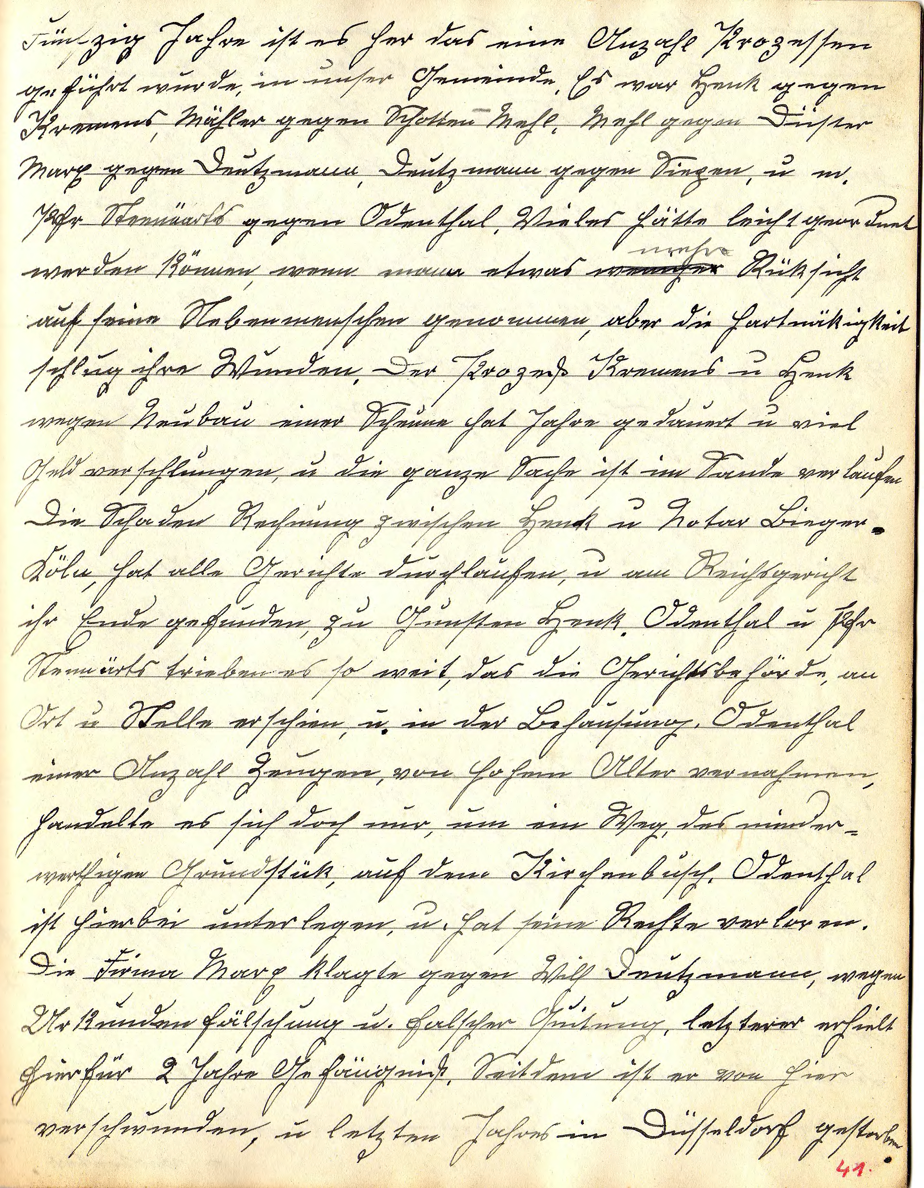 Fünfzig Jahre ist es her, dass eine Anzahl Prozessen geführt wurde in unser Gemeinde. Es war Henk gegen Kremer, Mähler gegen Schotten-Mehl. Mehl gegen Düster, Marx gegen Deutzmann, Deutzmann gegen Siepen u. m., Pfr. Steenarts gegen Odenthal. Vieles hätte leicht geordnet werden können, wenn man etwas mehr Rücksicht auf seine Nebenmenschen genommen, aber die Hartnäckigkeit schlug ihre Wunden. Der Prozess Kremer u. Henk wegen Neubau einer Scheune hat Jahre gedauert u. viel Geld verschlungen u. die ganze Sache ist im Sande verlaufen. Die Schaden Rechnung zwischen Henk u. Notar Binger, Köln, hat alle Gerichte durchlaufen u. am Reichsgericht ihr Ende gefunden, zu Gunsten Henk. Odenthal u. Pfr. Steenarts trieben es so weit, dass die Gerichtsbehörde an Ort u. Stelle erschien u. in der Behausung Odenthal eine Anzahl Zeugen von hohem Alter vernahmen, handelte es sich doch nur um ein Weg, des minderwertigen Grundstück, auf dem Kirchenbusch. Odenthal ist hierbei unterlegen, u. hat seine Rechte verloren. Die Firma Marx klagte gegen Wilh. Deutzmann, wegen Urkundenfälschung u. falscher Quittung, letzterer erhielt hierfür 2 Jahre Gefängnis. Seitdem ist er von hier verschwunden u. letzten Jahres in Düsseldorf gestorben.