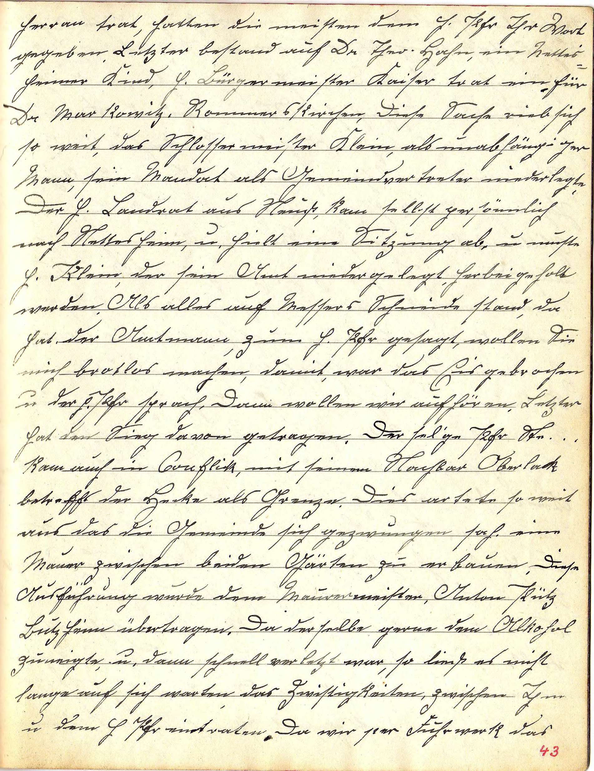 herantrat, hatten die meisten dem H. Pfr. Ihr Wort gegeben. Letzter bestand auf Dr. Theo Hahn, ein Nettesheimer Kind, H. Bürgermeister Kaiser trat ein für Dr. Markowitz, Rommerskirchen. Diese Sache rieb sich so weit, dass Schlossermeister Klein als unabhängiger Mann sein Mandat als Gemeindevertreter niederlegte. Der H. Landrat aus Neuß kam selbst persönlich nach Nettesheim, u. hielt eine Sitzung ab u. musste H. Klein, der sein Amt niedergelegt, herbeigeholt werden. Als alles auf Messers Schneide stand, da hat der Amtmann zum H. Pfr. gesagt, wollen Sie mich brotlos machen, damit war das Eis gebrochen u. der H. Pfr. sprach, Dann wollen wir aufhören. Letzter hat den Sieg davon getragen. Der sel’ge Pfr. Ste. kam auch in Konflikt mit seinem Nachbar Oberlack betreffs der Hecke als Grenze. Dies artete so weit aus, dass die Gemeinde sich gezwungen sah, eine Mauer zwischen beiden Gärten zu erbauen. Diese Ausführung wurde dem Maurermeister Anton Pütz, Butzheim, übertragen. Da derselbe gerne dem Alkohol zuneigte u. dann schnell verletzt war, so ließ es nicht lange auf sich warten, das Zwistigkeiten zwischen Ihm u. dem H. Pfr. eintraten. Da wir per Fuhrwerk das