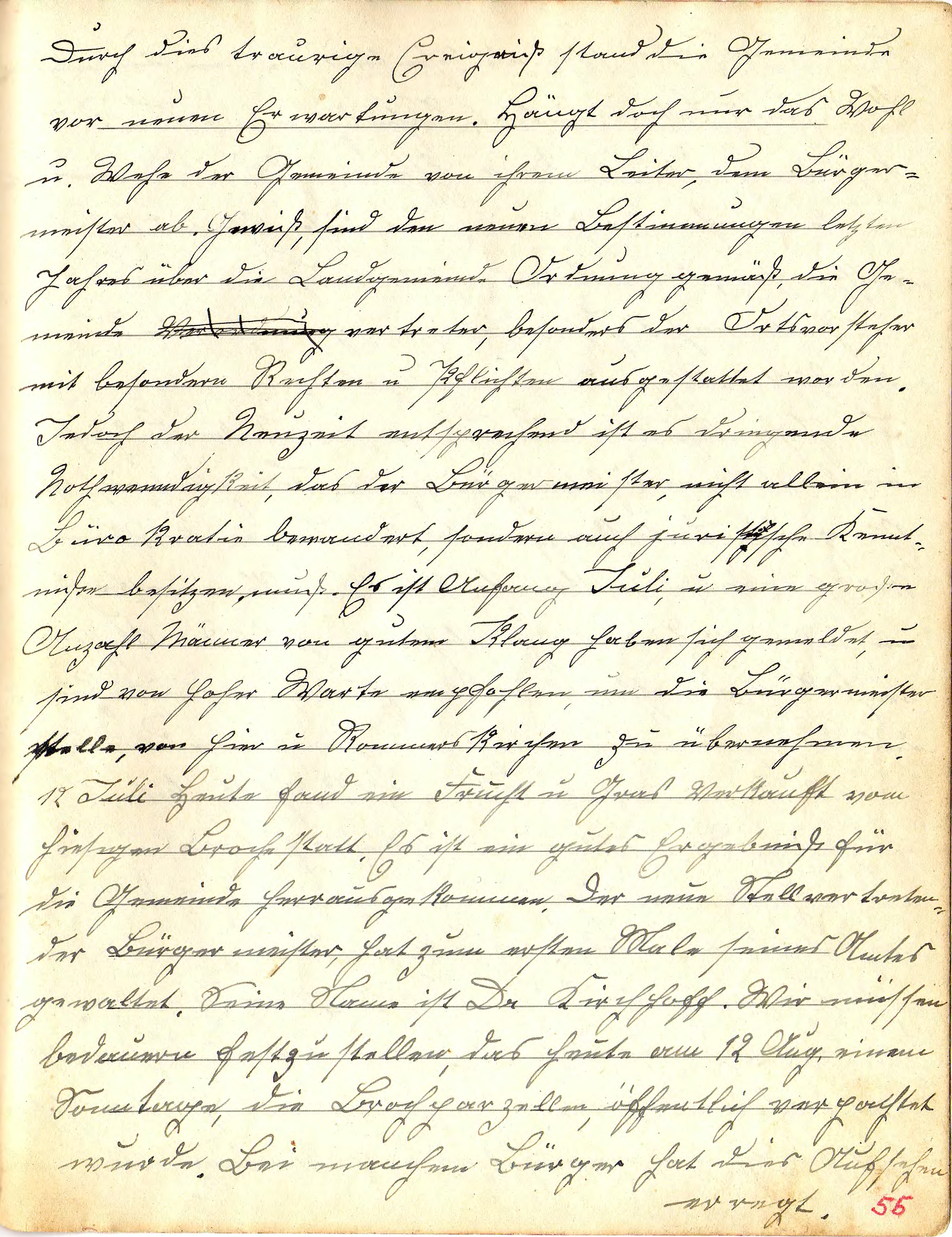 Durch dies traurige Ereignis stand die Gemeinde vor neuen Erwartungen. Hängt doch nur das Wohl u. Wehe der Gemeinde von ihrem Leiter, dem Bürgermeister ab. Gewiss sind den neuen Bestimmungen letzten Jahres über die Landgemeinde Ordnung gemäß die Gemeindevertreter, besonders der Ortsvorsteher mit besonderen Rechten u. Pflichten ausgestattet worden. Jedoch der Neuzeit entsprechend ist es dringende Notwendigkeit, dass der Bürgermeister nicht allein in Bürokratie bewandert, sondern auch juristische Kenntnisse besitzen muss. Es ist Anfang Juli u. eine große Anzahl Männer von gutem Klang haben sich gemeldet u. sind von hoher Warte empfohlen um die Bürgermeisterstelle von hier u. Rommerskirchen zu übernehmen. 12. Juli, heute fand ein Frucht u. Grasverkauf vom hiesigen Broiche statt. Es ist ein gutes Ergebnis für die Gemeinde herausgekommen. Der neue Stellvertretender Bürgermeister hat zum ersten Male seines Amtes gewaltet. Sein Name ist Dr. Kirchhoff. Wir müssen bedauern festzustellen, dass heute am 12. Aug., einem Sonntage, die Broichparzellen öffentlich verpachtet wurden. Bei manchem Bürger hat dies Aufsehen erregt.
