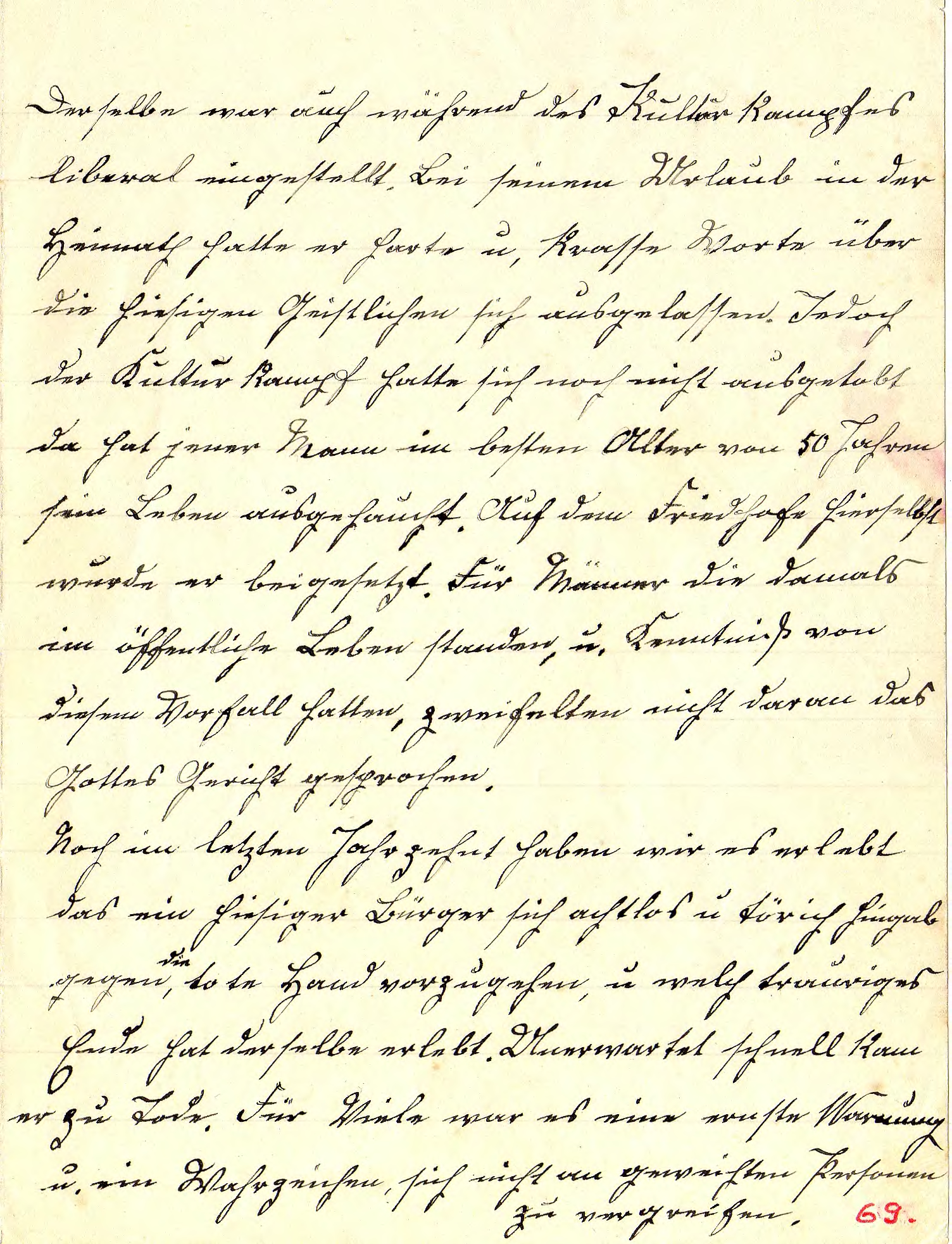 Derselbe war auch während des Kulturkampfes liberal eingestellt. Bei seinem Urlaub in der Heimat hatte er harte u. krasse Worte über die hiesigen Geistlichen sich ausgelassen. Jedoch der Kulturkampf hatte sich noch nicht ausgetobt, da hat jener Mann im besten Alter von 50 Jahren sein Leben ausgehaucht. Auf dem Friedhofe hierselbst wurde er beigesetzt. Für Männer, die damals im öffentlichen Leben standen u. Kenntnis von diesem Vorfall hatten, zweifelten nicht daran, dass Gottes Gericht gesprochen. Noch im letzten Jahrzehnt haben wir es erlebt, dass ein hiesiger Bürger sich achtlos u. töricht hingab gegen die tote Hand vorzugehen u. welch trauriges Ende hat derselbe erlebt. Unerwartet schnell kam er zu Tode. Für viele war es eine ernste Warnung u. ein Wahrzeichen, sich nicht an geweihten Personen zu vergreifen.