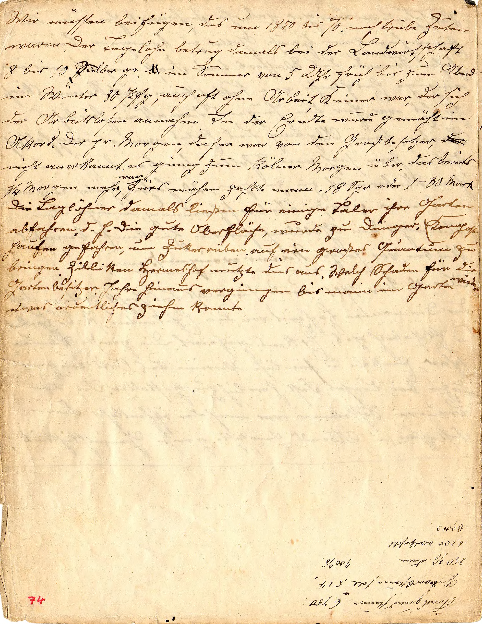 Wir müssen beifügen, dass um 1850 bis 70 noch trübe Zeiten waren. Der Tagelohn betrug damals bei der Landwirtschaft 8 bis 10 Silbergr. Im Sommer von 5 Uhr früh bis zum Abend, im Winter 30 Pfg., auch oft ohne Arbeit, keiner war, der sich der Arbeitslosen annahm. In der Ernte wurde gemäht im Akkord, der pr. Morgen, dahier war von den Großbesitzern nicht anerkannt, es ging zum Kölner Morgen über, das bereits 1⁄4 Morgen mehr war, fürs mähen zahlte man 18 Sgr. oder 1-80 Mark. Die Taglöhner damals ließen für einige Taler ihre Gärten abfahren, d. h. die gute Oberfläche wurde zu Dünger, Komposthaufen gefahren um Zuckerrüben auf ein großes Quantum zu bringen. Zilliken Hermeshof nutzte dies aus. Welch Schaden für die Gartenbesitzer. Jahre hinaus vergingen bis man im Garten wieder etwas ordentlich ziehen konnte.