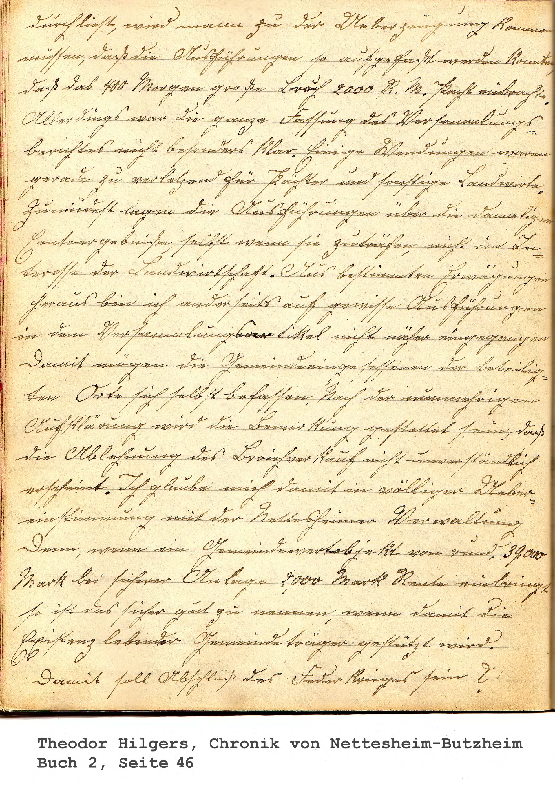 durchliest, wird mann zu der Ueberzeugung kommen müssen, daß die Ausführungen so aufgefaßt werden konnten, daß das 400 Morgen große Bruch 2000 R.M. Pacht einbrachte. Allerdings war die ganze Fassung des Versammlungsberichtes nicht besonders klar. Einige Wendungen waren geradezu verletzend für Pächter und sonstige Landwirte. Zumindest lagen die Ausführungen über die damaligen Ernteergebniße, selbst wenn sie zuträfen, nicht im Interesse der Landwirtschaft. Aus bestimmten Erwägungen heraus bin ich anderseits auf gewisse Ausführungen in dem Versammlungsartikel nicht näher eingegangen. Damit mögen die Gemeindeeingesessenen der beteiligten Orte sich sich selbst befassen. Nach der nunmehrigen Aufklärung wird die Bemerkung gestattet sein, daß die Ablehnung des Broichverkauf nicht unverständlich erscheint. Ich glaube mich damit in völliger Uebereinstimmung mit der Nettesheimer Verwaltung. Denn, wenn ein Gemeindewertobjekt von rund, 39.000 Mark bei sicherer Anlage 2.000 Mark Rente einbringt so ist das sicher gut zu nennen, wenn damit die Existenz lebender Gemeindeträger gestützt wird.