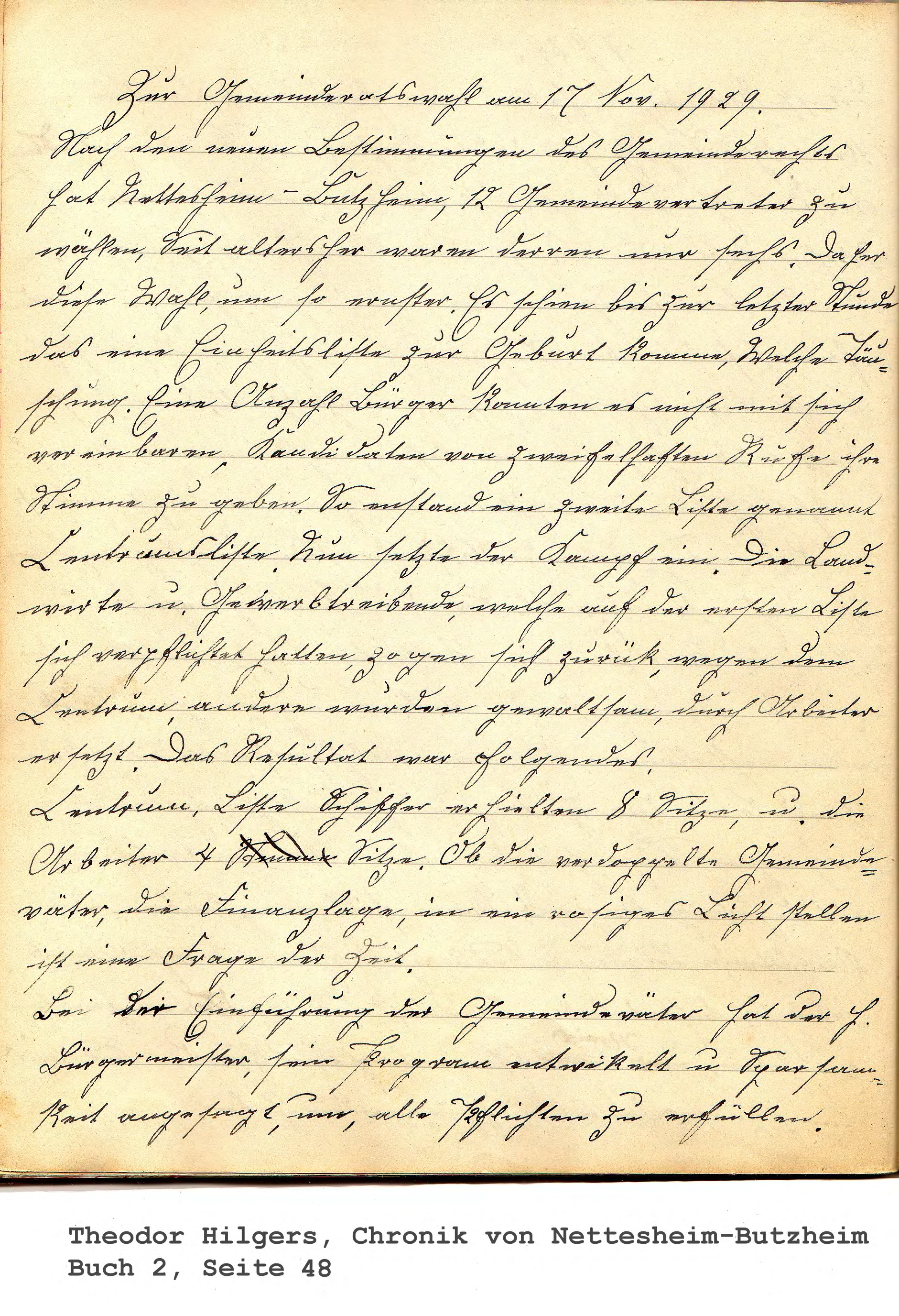 Nach den neuen Bestimmungen des Gemeinderechts hat Nettesheim-Butzheim, 12 Gemeindevertreter zu wählen, Seit altersher waren derren nur sechs. Daher diese Wahl, umso ernster. Es schien bis zur letzter Stunde das eine Einheitsliste zur Geburt komme, Welche Täuschung. Eine Anzahl Bürger konnten es nicht mit sich vereinbaren, Kandidaten von zweifelhaften Rufe ihre Stimme zu geben. So entstand ein zweite Liste genannt Centrumsliste. Nun setzte der Kampf ein. Die Landwirte u. Gewerbtreibende, welche auf der ersten Liste sich verpflichtet hatten, zogen sich zurück, wegen dem Centrum, andere wurden gewaltsam, durch Arbeiter ersetzt. Das Resultat war folgendes,