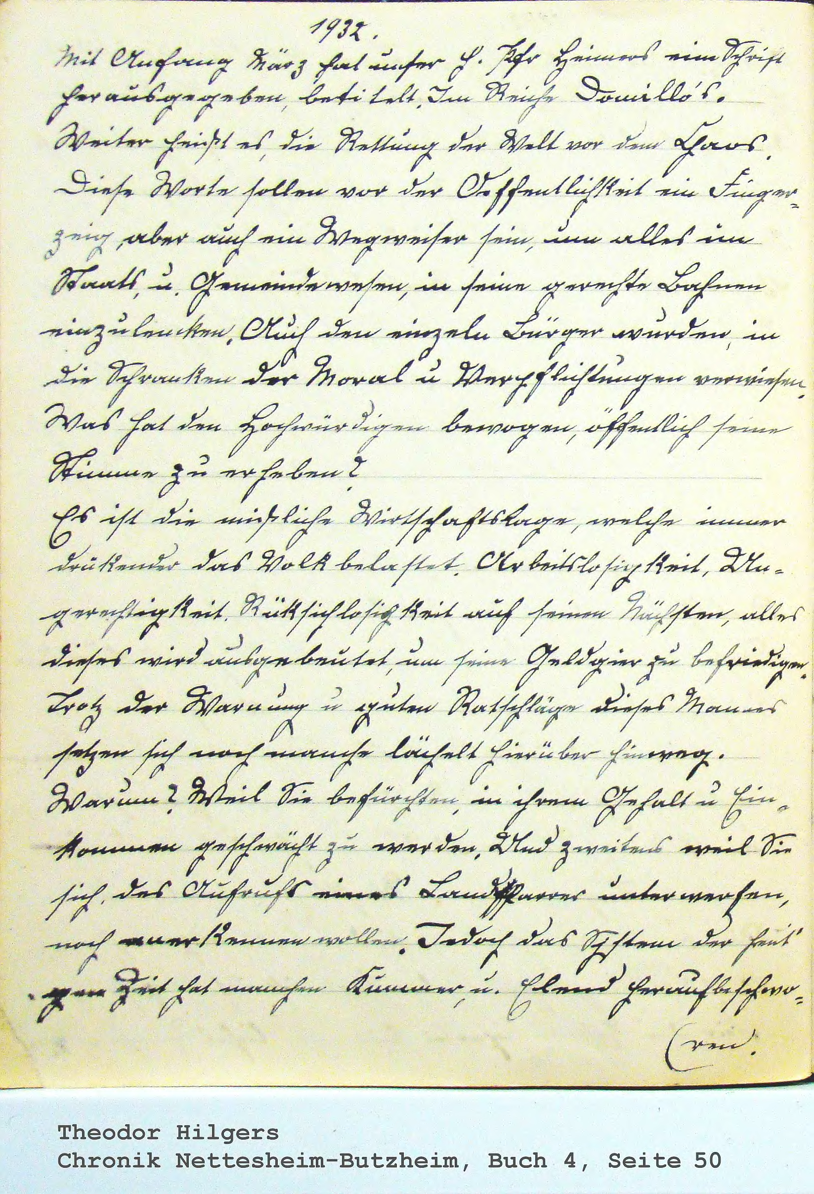 Weiter heißt es, die Rettung der Welt vor dem Chaos. Diese Worte sollen vor der Öffentlichkeit ein Fingerzeig, aber auch ein Wegweiser sein, um alles im Staats, u. Gemeindewesen, in seine gerechte Bahnen einzulenken. Auch den einzeln[en] Bürgern wurden, in die Schranken der Moral u. Verpflichtungen verwiesen. Was hat den Hochwürdigen bewogen, öffentlich seine Stimme zu erheben?