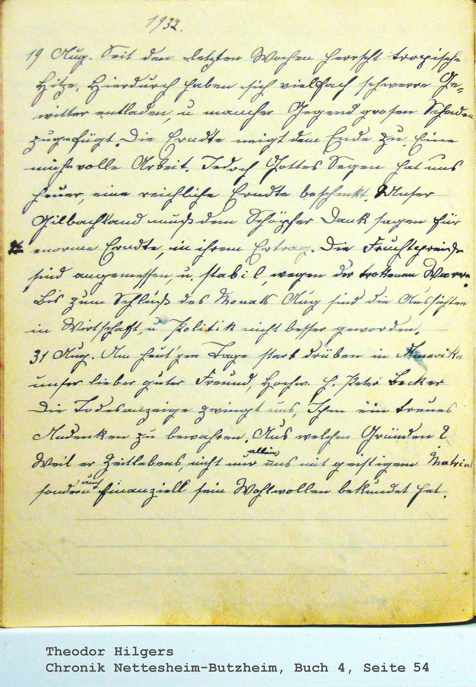 19. Aug. Seit den letzten Wochen herrscht tropische Hitze. Hierdurch haben sich vielfach schwerre Gewitter entladen, u. mancher Gegend großen Schaden zugefügt. Die Ern(d)te neigt [sich] dem Ende zu. Eine mühevolle Arbeit. Jedoch Gottes Segen hat uns heuer, eine reichliche Ern(d)te beschenkt. Unser Gilbachland muß dem Schöpfer Dank sagen für enorme Ern(d)te, in ihrem Ertrag. Die Fruchtpreise sind angemessen, u. stabil, wegen der tro[c]kenen Warre???