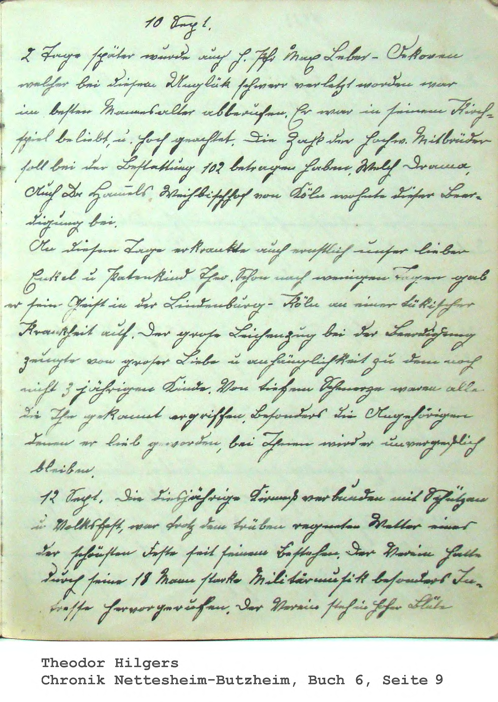An diesem Tage erkrankte auch ernstlich unser lieber Enkel u. Patenkind Theo. Schon nach wenigen Tagen gab er seinen Geist in der Lindenburg -Köln an einer tü[c]kischer Krankheit auf. Der große Leichenzug bei der Beerdigung zeugte von gros[ß]er Liebe u. Anhänglichkeit zu dem noch nicht 3 jährigen Kinde. Von tiefem Schmerze waren alle die Ihn gekannt ergriffen. Besonders die Angehörigen denen er lieb geworden, bei Ihnen wird er unvergeßlich bleiben.