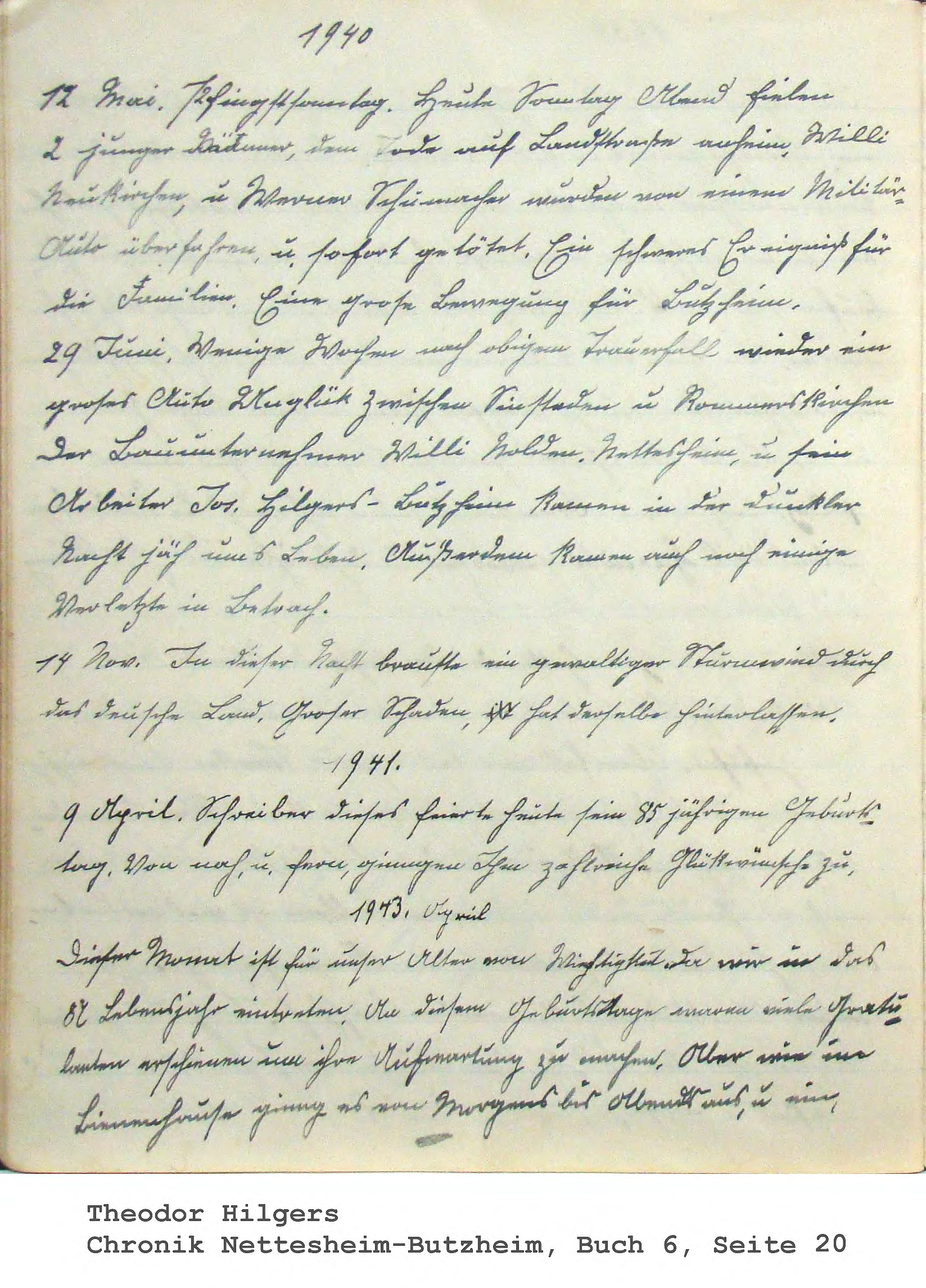 12. Mai. Pfingstsonntag. Heute Sonntag Abend fielen 2 junger Männer, dem Tode auf [der] Landstraße anheim. Willi Neukirchen, u. Werner Schumacher wurden von einem Militär-Auto überfahren, u. sofort getötet. Ein schweres Ereigniß für die Familien. Eine große Bewegung für Butzheim.