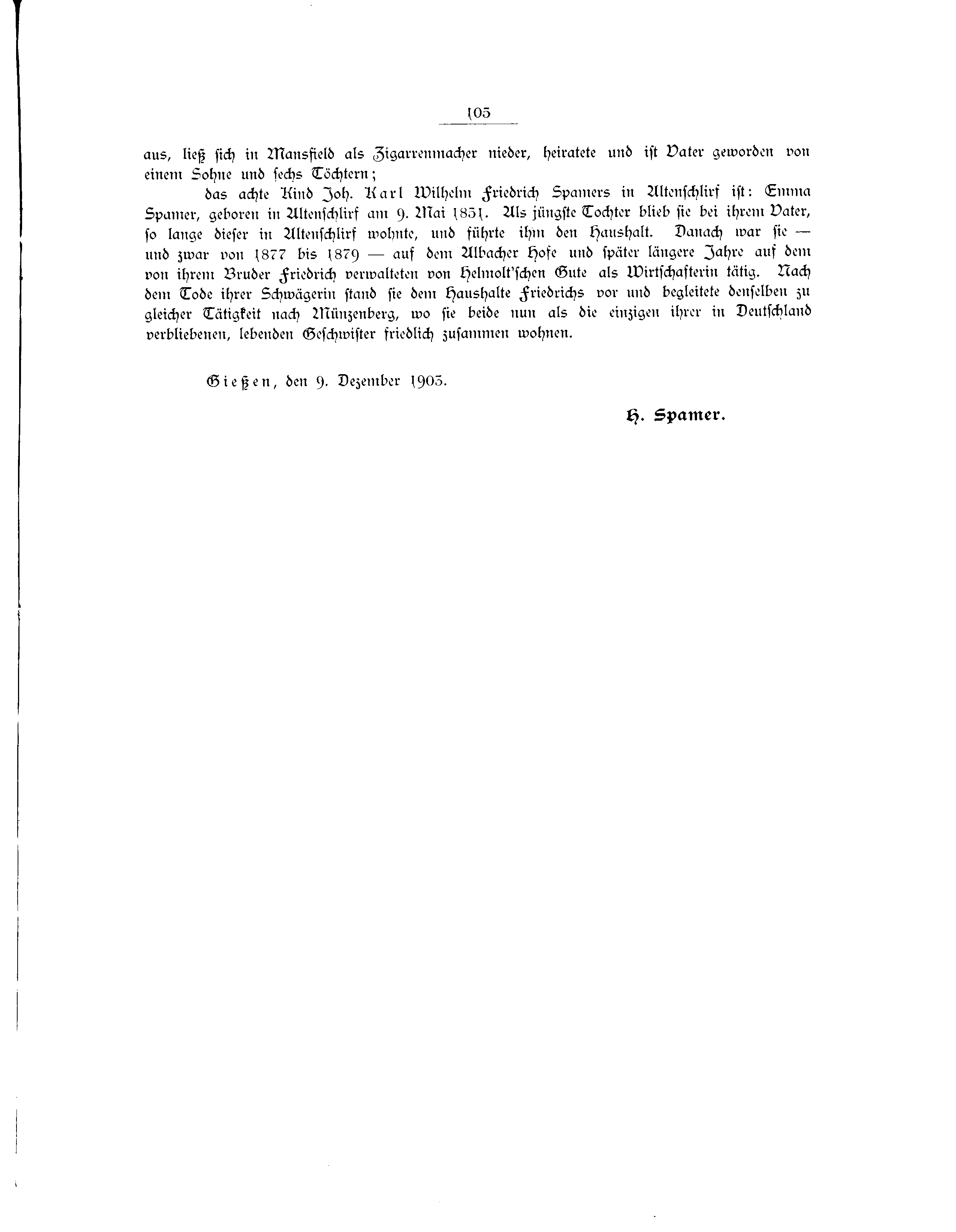das achte Kind Joh. Karl Wilhelm Friedrich Spamers in Altenschlirf ist: Emma Spamer, geboren in Altenschlirf am 9. Mai 1851. Als jüngste Tochter blieb sie bei ihrem Vater, so lange dieser in Altenschlirf wohnte, und führte ihm den Haushalt. Danach war sie — und zwar von 1877 bis 1879 — auf dem Albacher Hofe und später längere Jahre auf dem von ihrem Bruder Friedrich verwalteten von Helmolt'schen Gute als Wirtschafterin tätig. Nach dem Tode ihrer Schwägerin stand sie dem Haushalte Friedrichs vor und begleitete denselben zu gleicher Tätigkeit nach Münzenberg, wo sie beide nun als die einzigen ihrer in Deutschland verbliebenen, lebenden Geschwister friedlich zusammen wohnen.