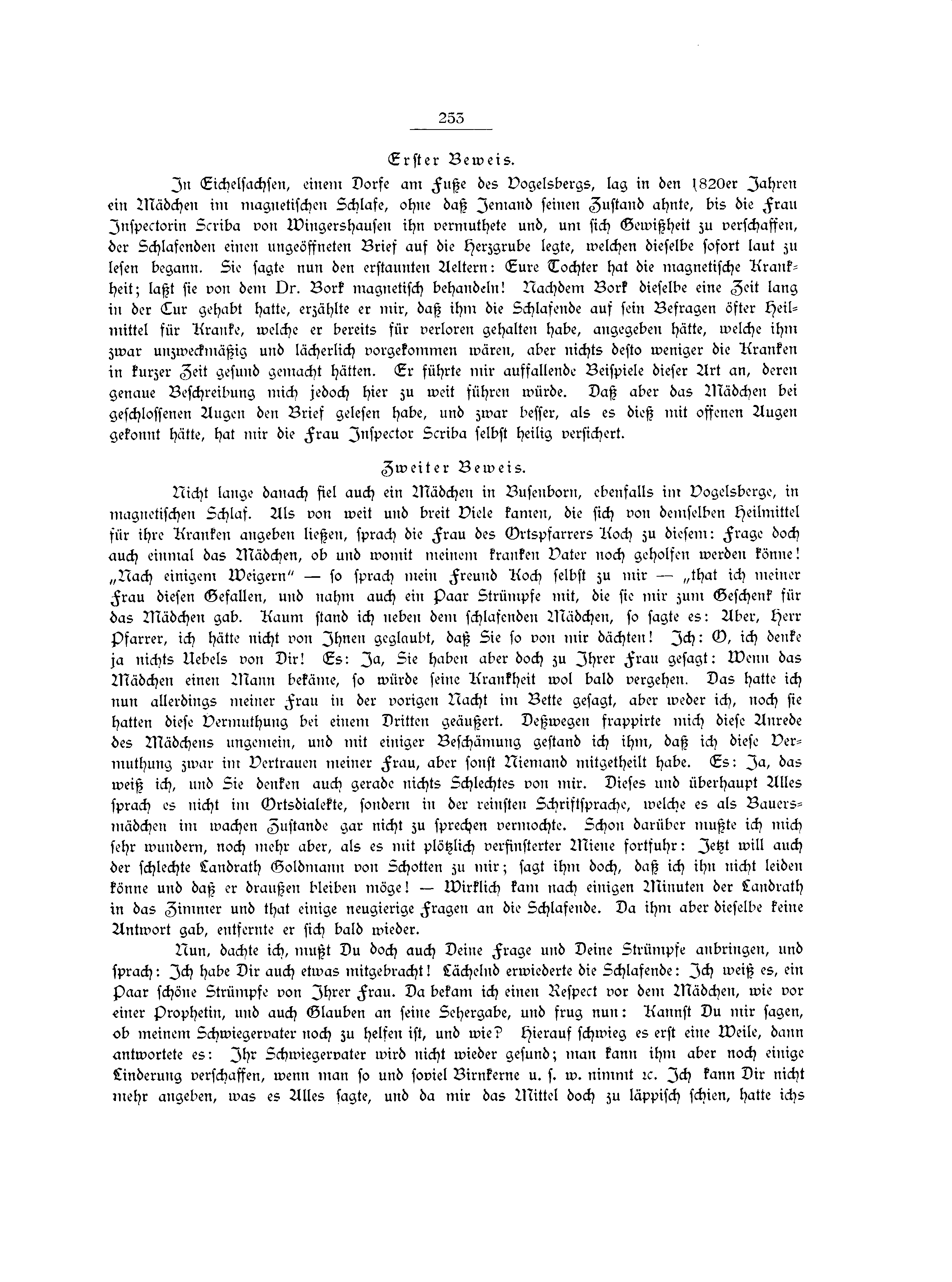 In Eichelsachsen, einem Dorfe am Fuße des Vogelsbergs, lag in den 1820er Jahren ein Mädchen im magnetischen Schlafe, ohne daß Jemand seinen Zustand ahnte, bis die Frau Inspectorin Scriba von Wingershausen ihn vermuthete und, um sich Gewißheit zu verschaffen, der Schlafenden einen ungeöffneten Brief auf die Herzgrube legte, welchen dieselbe sofort laut zu lesen begann. Sie sagte nun den erstaunten Aeltern: Eure Tochter hat die magnetische Krankheit; laßt sie von dem Dr. Bork magnetisch behandeln! Nachdem Bork dieselbe eine Zeit lang in der Cur gehabt hatte, erzählte er mir, daß ihm die Schlafende auf sein Befragen öfter Heilmittel für Kranke, welche er bereits für verloren gehalten habe, angegeben hätte, welche ihm zwar unzweckmäßig und lächerlich vorgekommen wären, aber nichts desto weniger die Kranken in kurzer Zeit gesund gemacht hätten. Er führte mir auffallende Beispiele dieser Art an, deren genaue Beschreibung mich jedoch hier zu weit führen würde. Daß aber das Mädchen bei geschlossenen Augen den Brief gelesen habe, und zwar besser, als es dieß mit offenen Augen gekonnt hätte, hat mir die Frau Inspector Scriba selbst heilig versichert.