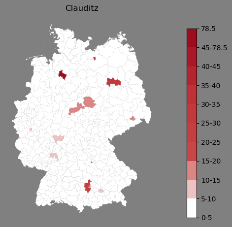 Relative Verteilung des Namens Clauditz (1996)Direkt zur Karte Die Farbskala zeigt die Anzahl von "Clauditz" bezogen auf je 1 Million Einträge. |