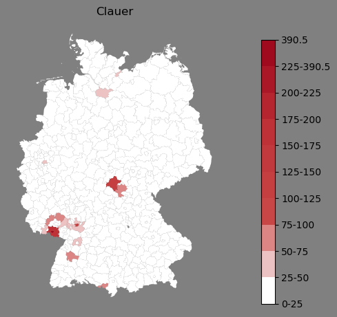 Relative Verteilung des Namens Clauer (1996)Direkt zur Karte Die Farbskala zeigt die Anzahl von "Clauer" bezogen auf je 1 Million Einträge. |