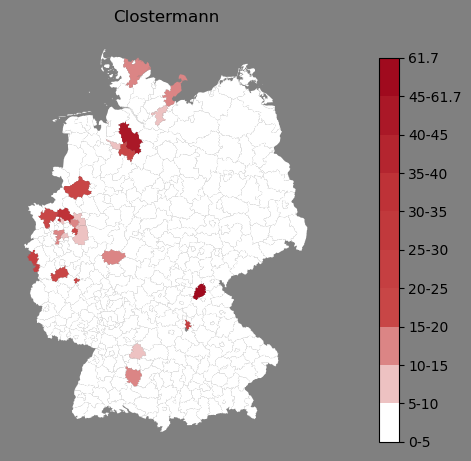 Absolute Verteilung des Namens Clostermann (1890)Direkt zur Karte Absolute Verteilung des Namens "Clostermann" um 1890 im damaligen Deutschen Reich Sie können die Karte innerhalb des Fensters zoomen und verschieben. |