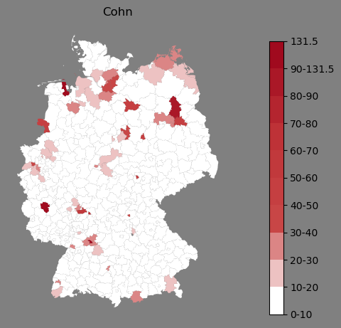 Relative Verteilung des Namens Cohn (1996)Direkt zur Karte Die Farbskala zeigt die Anzahl von "Cohn" bezogen auf je 1 Million Einträge. |