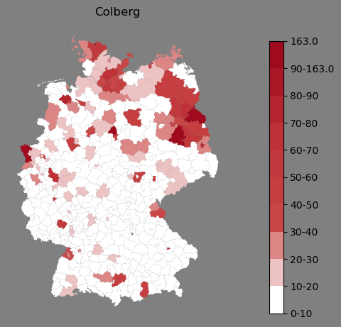 Absolute Verteilung des Namens Colberg (1890)Direkt zur Karte Absolute Verteilung des Namens "Colberg" um 1890 im damaligen Deutschen Reich Sie können die Karte innerhalb des Fensters zoomen und verschieben. |