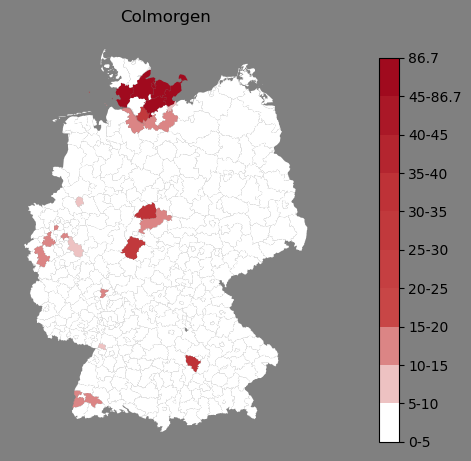 Relative Verteilung des Namens Colmorgen (1996)Direkt zur Karte Die Farbskala zeigt die Anzahl von "Colmorgen" bezogen auf je 1 Million Einträge. |