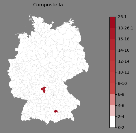 Relative Verteilung des Namens Compostella (1996)Direkt zur Karte Die Farbskala zeigt die Anzahl von "Compostella" bezogen auf je 1 Million Einträge. |