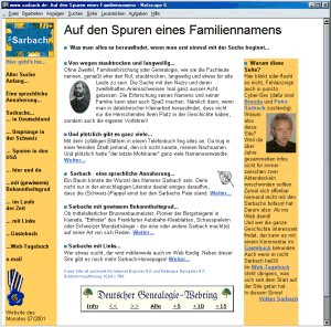 Der "Computergenealogie-Award" geht im driten Quartal 2001 an Volker Sarbach aus Geesthacht (Schleswig-Holstein). Er präsentiert unter http://www.sarbach.de eine "erfrischende Website", die sich merklich von dem abhebt, was man gemeinhin in der genealogischen Landschaft so findet. Der Autor selbst meint, Genealogie sei weder "staubtrocken noch langweilig" und genau das gilt auch für seine Website. Volker Sarbach zeigt uns, dass und wie es möglich ist, neben den reinen Forschungsergebnissen auch die "individuellen Freuden und Leiden" der eigenen Forschungsarbeit (die nicht eben selten vom Prinzip Zufall vorangetrieben wird) optisch ansprechend und so darzustellen, dass "Langeweile" wirklich ein Fremdwort bleibt. Den vollständigen Inhalt seiner Website muss (und sollte) man sich "erarbeiten" - diese Arbeit adelt zwar nicht, eröffnet dafür aber den Blick auf die unendlichen Weiten, die im Zusammenhang mit dem Familiennamen Sarbach schon erschlossen sind und noch erschlossen werden wollen.