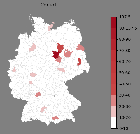 Relative Verteilung des Namens Conert (1996)Direkt zur Karte Die Farbskala zeigt die Anzahl von "Conert" bezogen auf je 1 Million Einträge. |