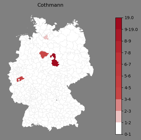 Relative Verteilung des Namens Cothmann (1996)Direkt zur Karte Die Farbskala zeigt die Anzahl von "Cothmann" bezogen auf je 1 Million Einträge. |