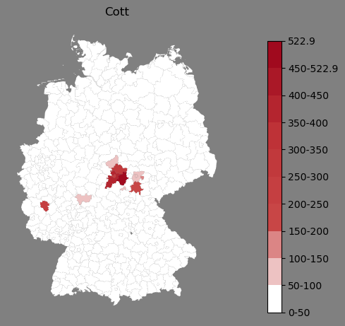 Relative Verteilung des Namens Cott (1996)Direkt zur Karte Die Farbskala zeigt die Anzahl von "Cott" bezogen auf je 1 Million Einträge. |