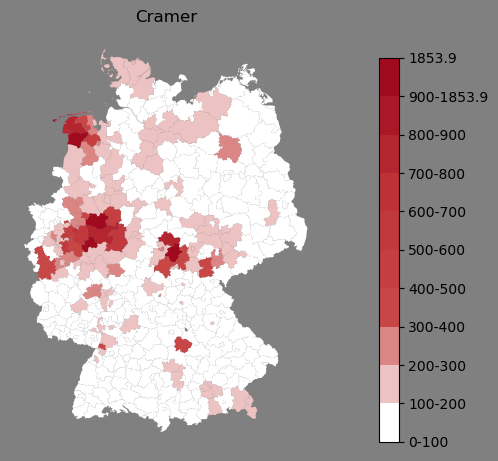 Absolute Verteilung des Namens Cramer (1890)Direkt zur Karte Absolute Verteilung des Namens "Cramer" um 1890 im damaligen Deutschen Reich Sie können die Karte innerhalb des Fensters zoomen und verschieben. |