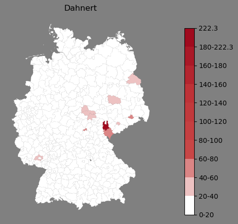 Relative Verteilung des Namens Dahnert (1996)Direkt zur Karte Die Farbskala zeigt die Anzahl von "Dahnert" bezogen auf je 1 Million Einträge. |