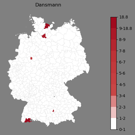Relative Verteilung des Namens Dansmann (1996)Direkt zur Karte Die Farbskala zeigt die Anzahl von "Dansmann" bezogen auf je 1 Million Einträge. |