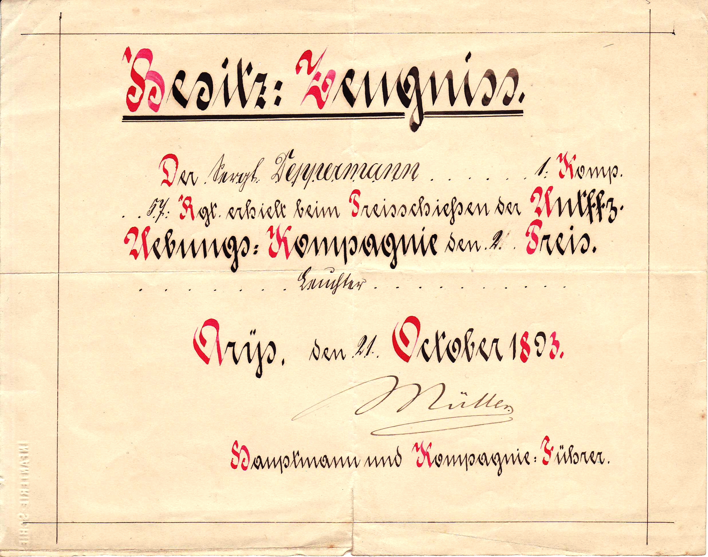 Besitzzeugnis Preisschießen: 1893 am 21. Oktober das Besitz-Zeugnis an den Sergeanten Deppermann über den Erhalt des 2. Preises beim Preisschießen der Untffz. Uebungs-Kompagnie im sehr bekannten Übungsgelände Arys, Kreis Johannisburg, Ostpreußen |