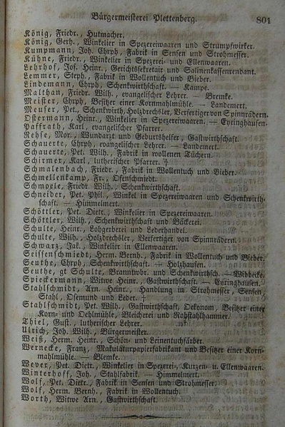 - Beschreibung: Adressbuch von 1834, Seite 801 - Bürgermeisterei Plettenberg