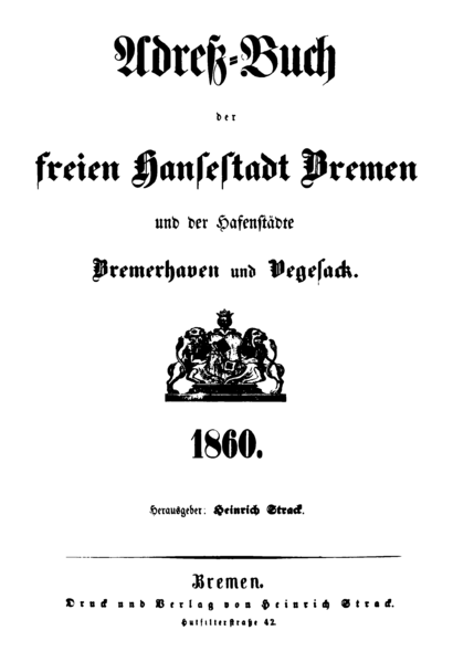 | aktuell | 18:14, 11. Jun. 2016 | 2.139 × 3.127 (34 KB) | Jzedlitz (Diskussion • Beiträge) | {{Information |Beschreibung = Titelblatt Adressbuch Bremen 1860 |Quelle = SUUB |Urheber = |Datum = |Scans = |Genehmigung = {{PD-old}} |Andere_Versionen = |Anmerkungen = }} Category:Addressbook |