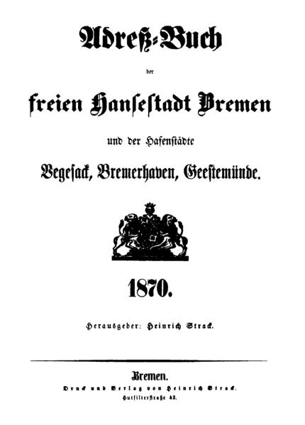 | aktuell | 21:00, 21. Mai 2014 | 2.030 × 2.828 (27 KB) | Jzedlitz (Diskussion • Beiträge) | {{Information |Beschreibung = Titel des Adressbuchs Bremen 1870 |Quelle = |Urheber = |Datum = 1870 |Scans = SuUB |Genehmigung = |Andere_Versionen = |Anmerkungen = }} Category:Addressbook |