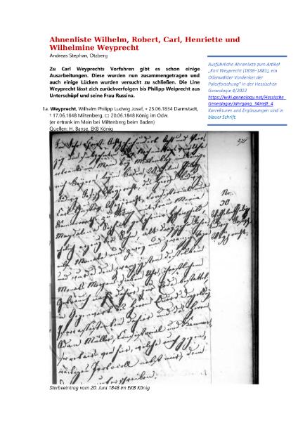 Ausführliche Ahnenliste zum Artikel „Karl Weyprecht (1838–1881), ein Odenwälder Vordenker der Polarforschung“ in der Hessischen Genealogie 4/2022 https://wiki.genealogy.net/Hessische_Genealogie/Jahrgang_5#Heft_4 |