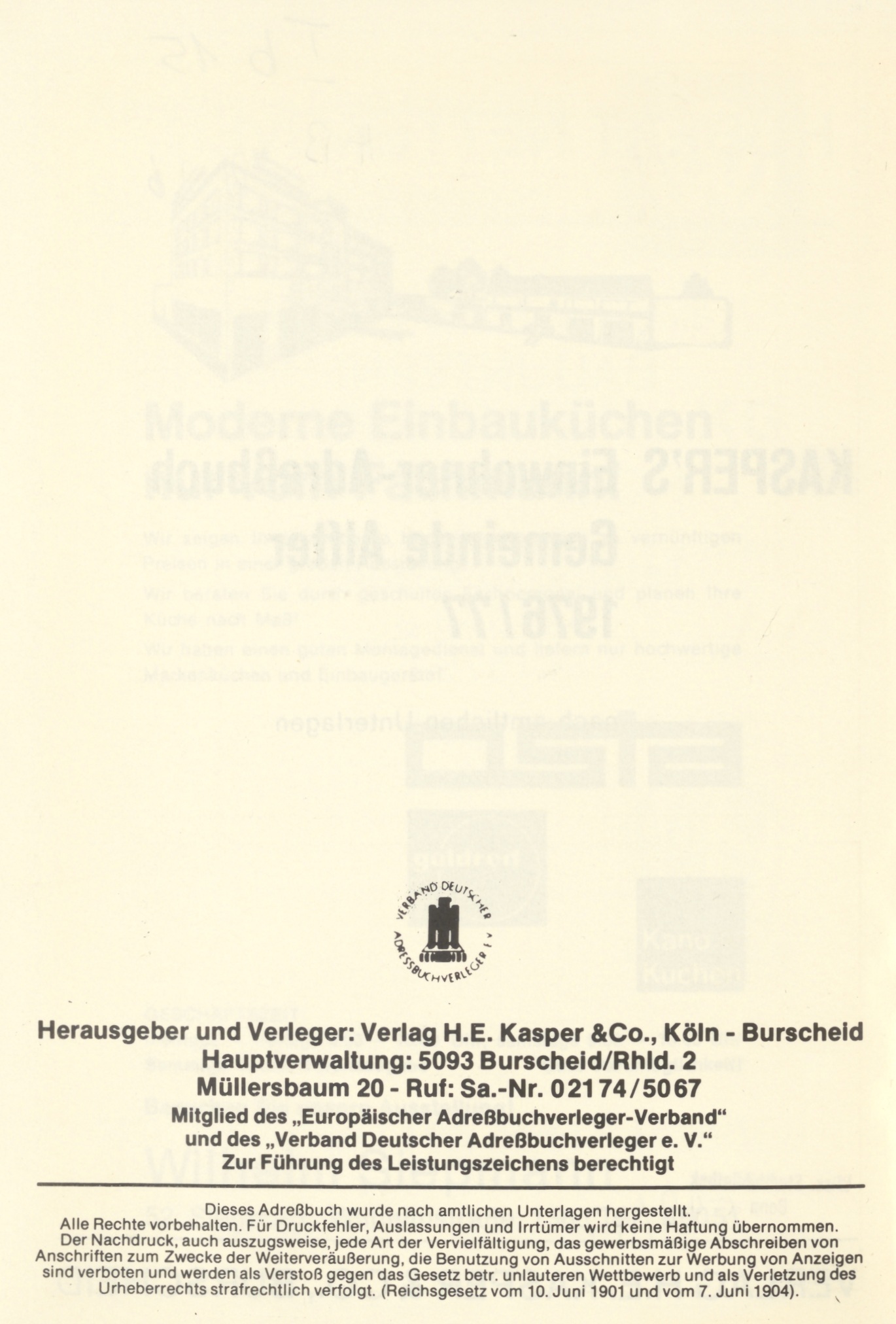 Kasper's Einwohner-Adreßbuch Gemeinde Alfter 1976/77, Impressum |