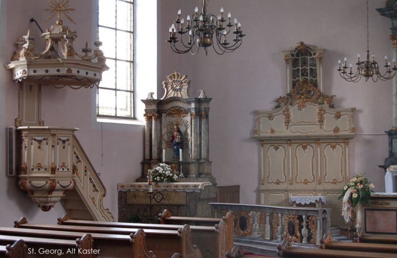 Kanzel und linker Seitenaltar der St. Georgskirche in Alt Kaster | |||