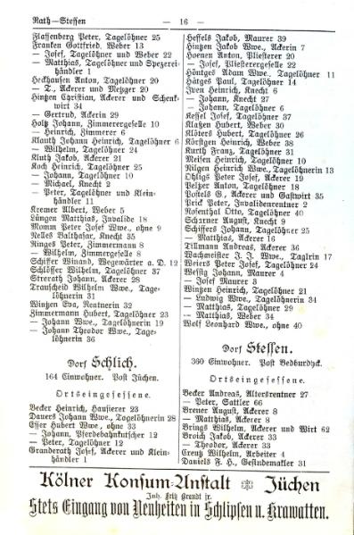 | aktuell | 21:38, 30. Jun. 2017 | 1.400 × 2.273, 11 Seiten (4,05 MB) | KlausErdmann (Diskussion • Beiträge) | {{Information |Beschreibung =;Adressbuch der Bürgermeisterei Bedburdyck im [http://wiki-de.genealogy.net/Kreis_Grevenbroich/Adressbuch_1906 Grevenbroicher Kreisadreßbuch von 1906] |Quelle = Gemeindearchiv Jüchen |Urheber = Druck |