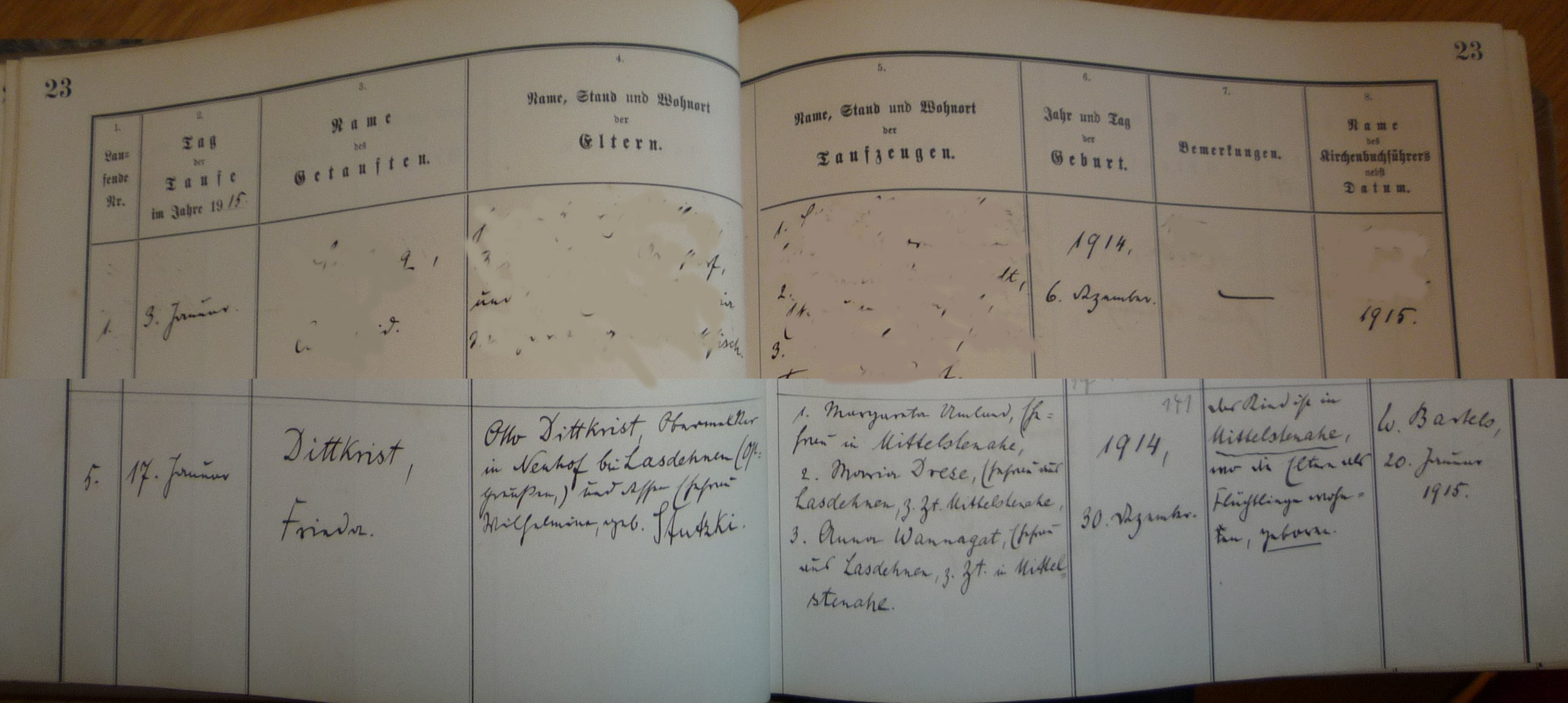 Kirchenbucheinträge im Kirchspiel Lamstedt(Landkreis Cuxhaven) von 1915, Bezug zu Neuhof Lasdehnen/ Altbaum, Kreis Schloßberg, Ostpreußen