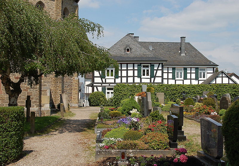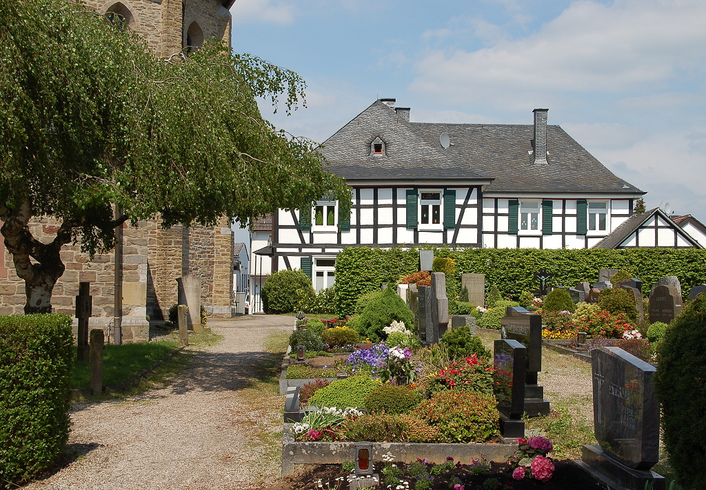 Blick vom Kirchfriedhof auf das Pfarrhaus der kath. Pfarrkirche St. Mariä Geburt in Birk