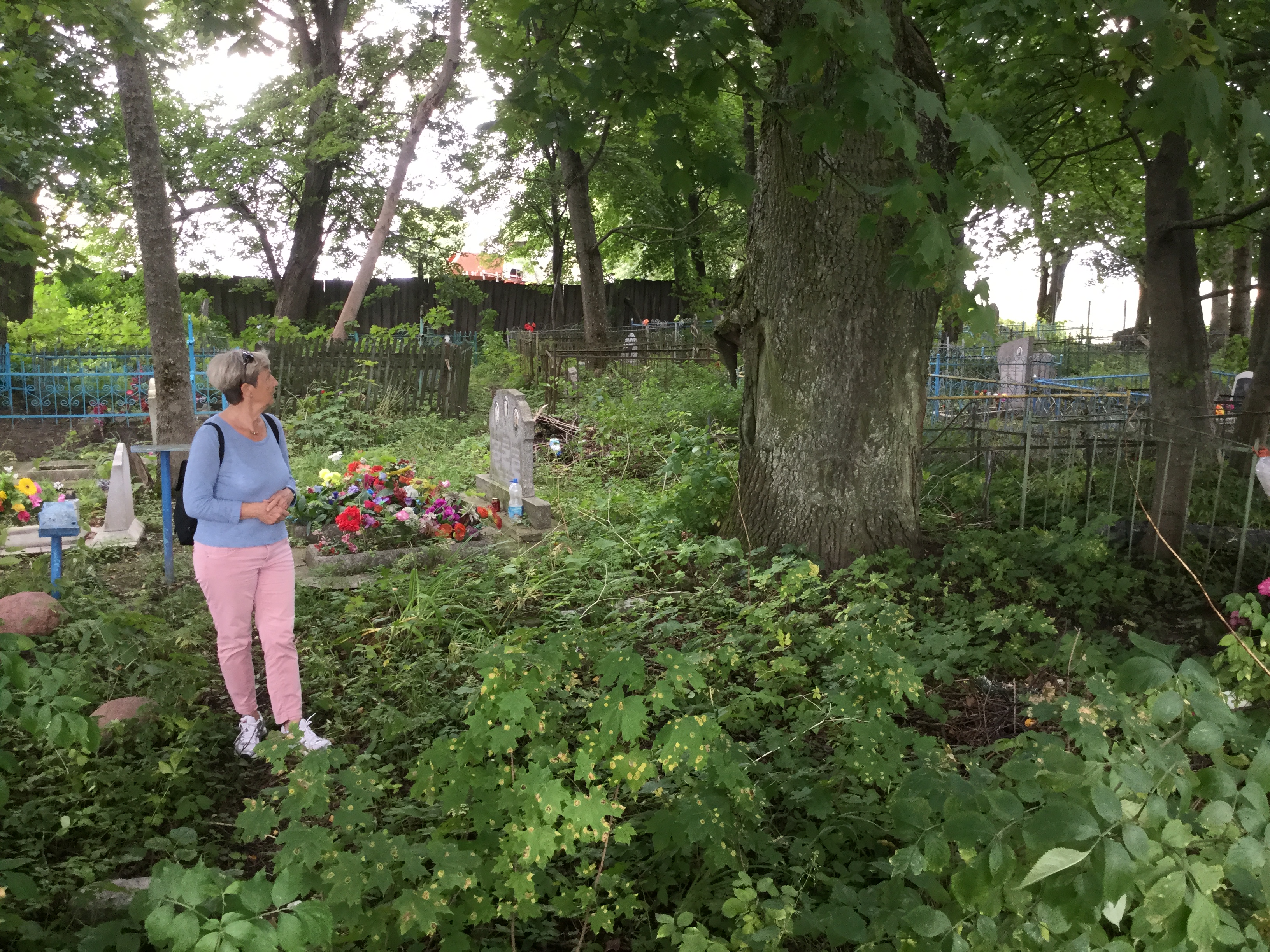 Kalinowka (Ksp. Aulenbach) - Ute Schulz im ehemaligen Garten ihrer Vorfahren. Garten der Villa Teufel, heute ein verlassener russischer Friedhof. |