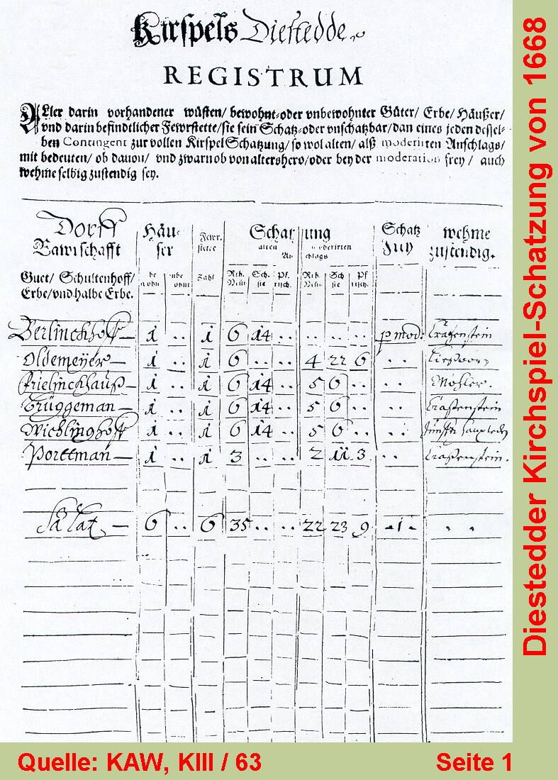 Kirchspielschatzung Diestedde von 1668, Seite 1 | |||