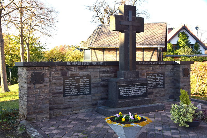 Das Denkmal für die Opfer der beiden Weltkriege an der Kirche Mariä Himmelfahrt in Disternich | ||||